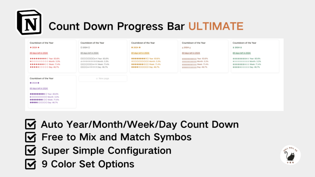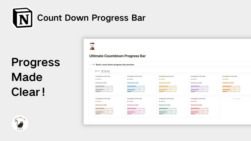 Introducing our Count Down Progress Bar, crafted with Notion formulas for a seamless and efficient experience! This innovative tool allows you to visually track the remaining days of the year, as well as the progress of the current month, week and day. Enjoy a faster loading speed compared to standard plugins, with an aesthetic that perfectly matches Notion’s native templates.
