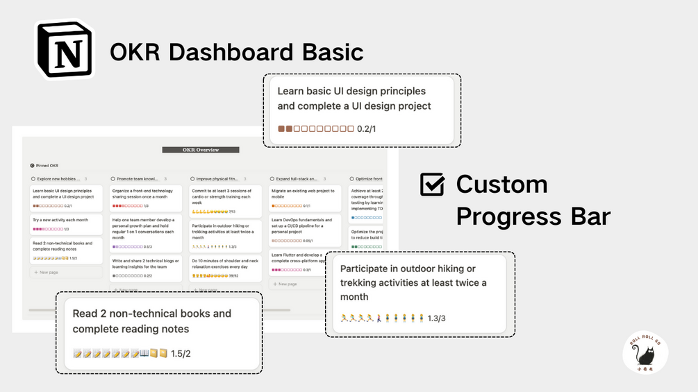 - Add a touch of fun with customizable KR progress bars to keep motivation high and progress visible, making each task an engaging milestone.