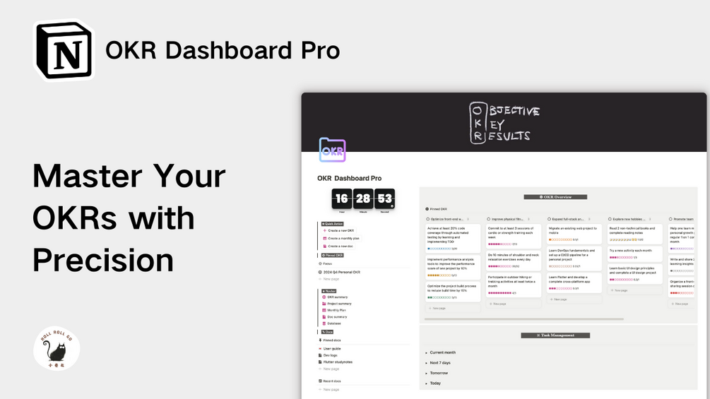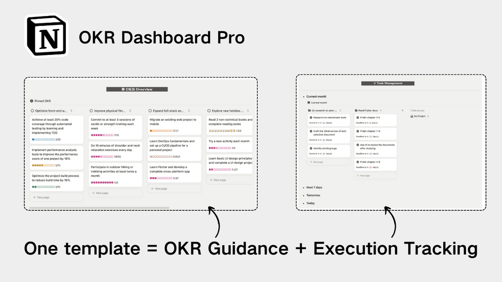 Introducing our OKR Dashboard Pro Notion template! This advanced template goes beyond the basics, offering a powerful suite for structured goal-setting and task execution that adapts to your workflow seamlessly.